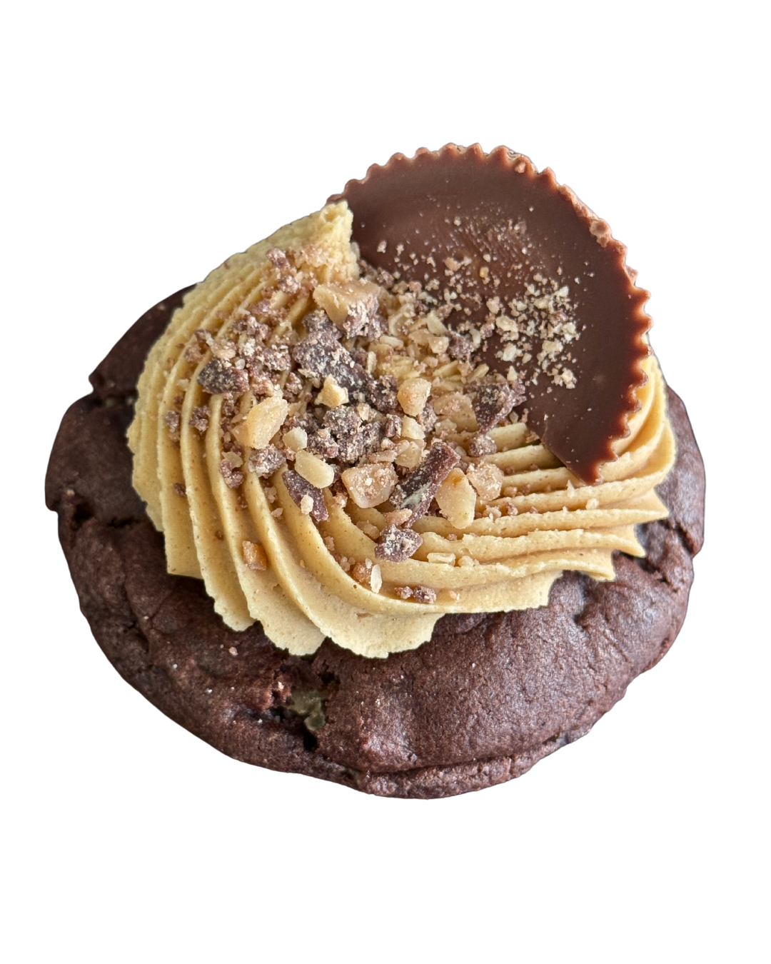 A Chocolate Cookie with Peanut Butter Chips and Heath Pieces mixed throughout. Topped with a Creamy Peanut Butter Buttercream, a Peanut Butter Cup and more Heath Bits.