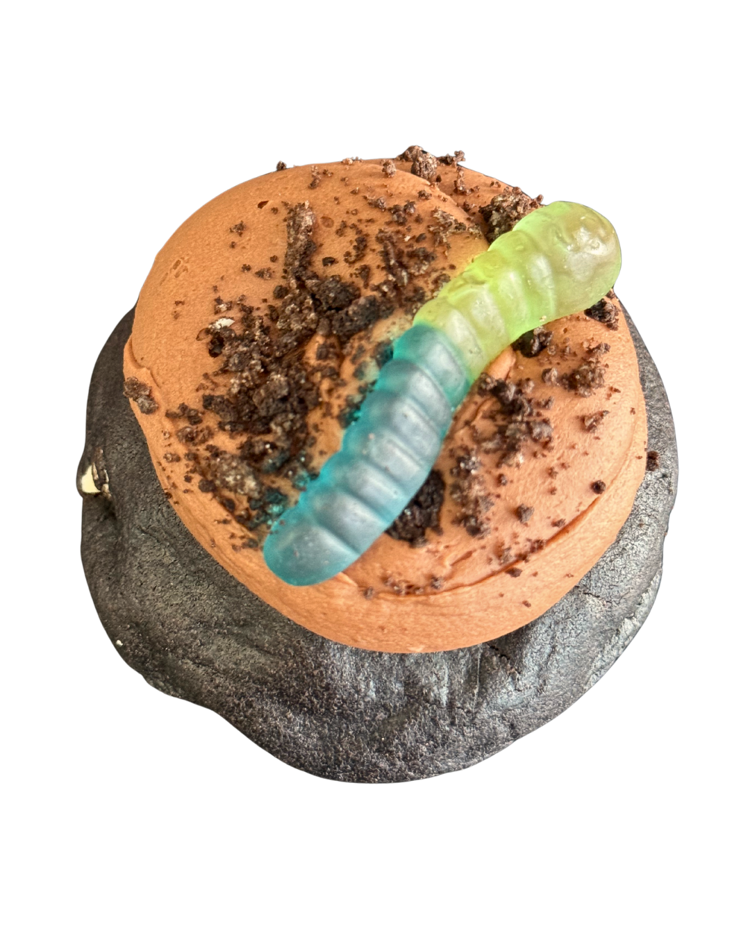 A Black Cocoa Cookie with White Chocolate Chips mixed throughout. Topped with a Silky Chocolate Buttercream, Oreo Crumbs, and a Gummy Worm.