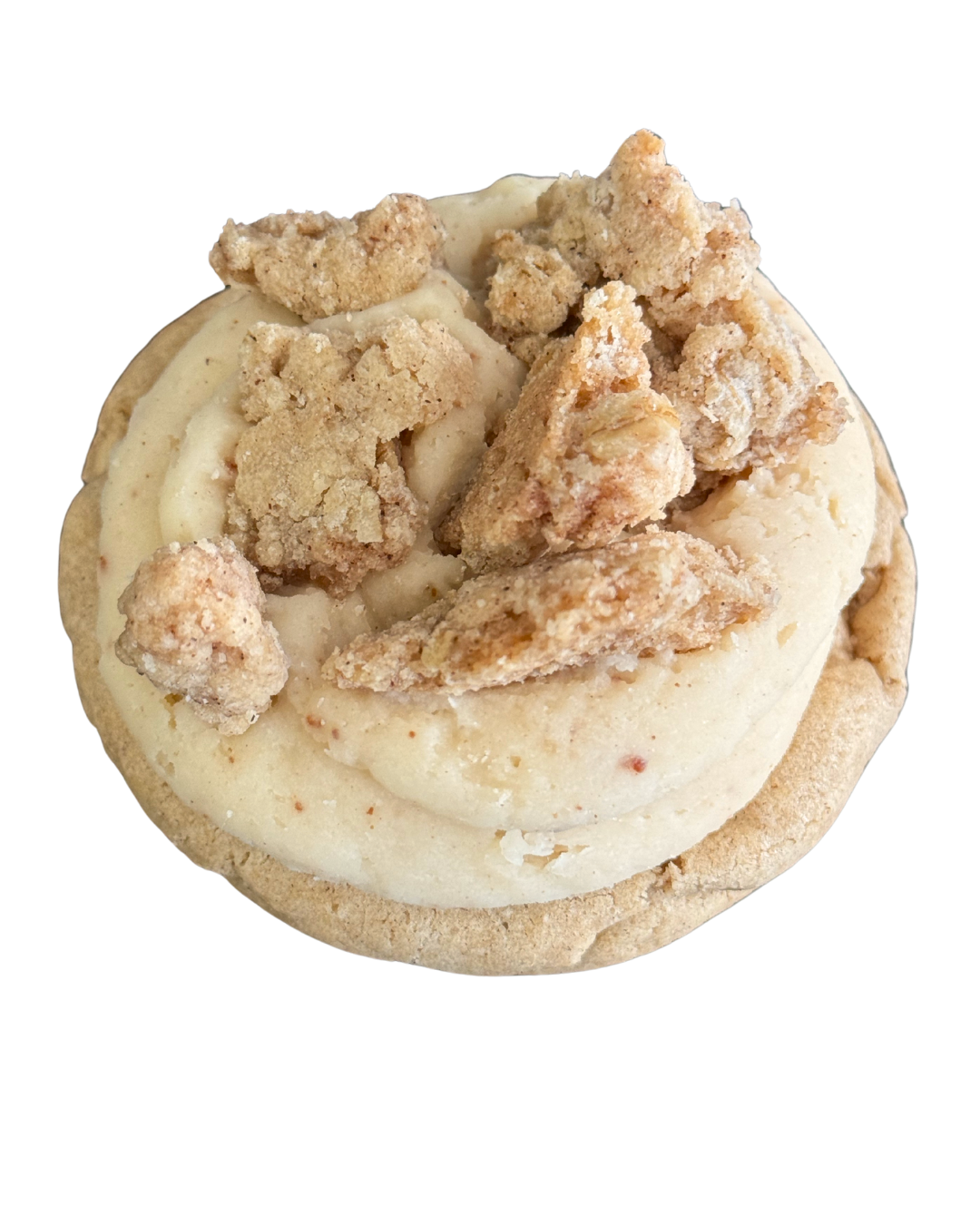 A Brown Butter Pumpkin Spice Cookie with Butterscotch Chips and White Chocolate Chips mixed throughout. Topped with a Brown Butter Cream Cheese Buttercream and an Oat Streusel.