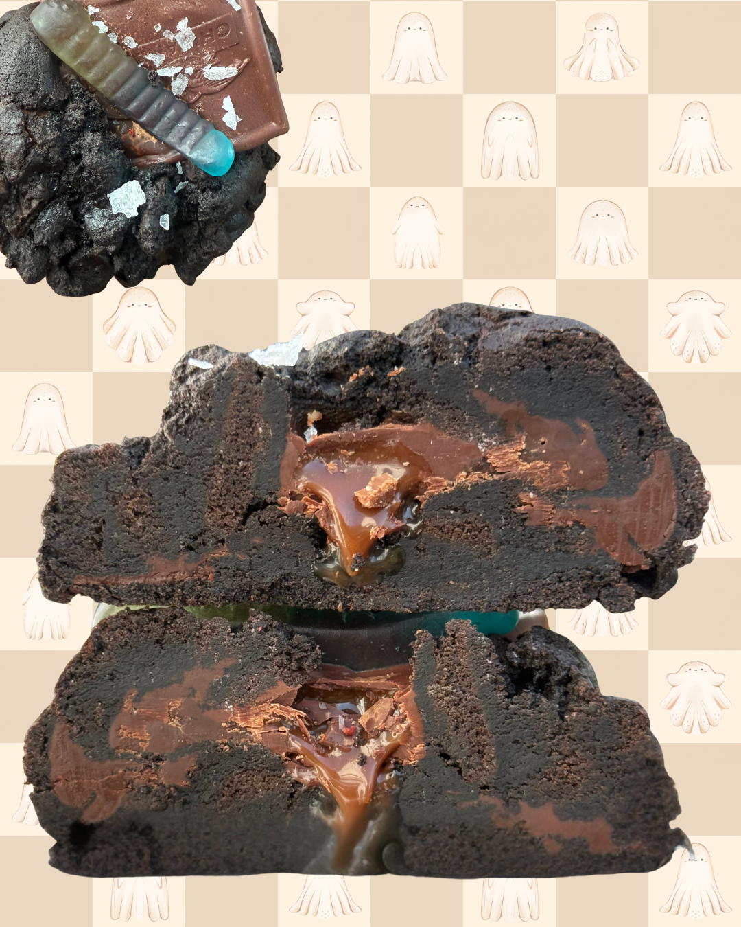 A Black Cocoa Cookie packed with Dark Chocolate Chips and Dark Chocolate Oreo's. Finished with a Lava Chocolate Ghirardelli Square and Gummy Worm and finished with Sea Salt Flakes.